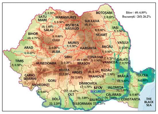 Distribution of respondents in Romania, by counties (number; percentage), Source: own processing of data & filling in a template from online free source [38].