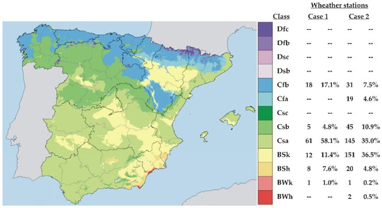 Table S1 in Supplementary Data shows the geographical and topographical data, as well as the Köppen–Geiger climate classification of the 414 radiometric stations used in this article, either for training or validation purposes. Stations No.1 to 105 are those used in previous works [12,13,17], operated by the Spanish State Meteorological Agency, Spanish Ministry of Environmental Issues, Environmental Climatology Information Network of the Andalusian Regional Government, Service of Environmental Information of the Principality of Asturias, and City Council of Gijón. Stations No.106 to 414 are the ones introduced in this paper, operated by the Spanish Ministry of Agriculture, Fisheries and Food. Figure 1 shows the distribution of the 414 stations, according to the Köppen–Geiger climate classification [26]. The variety of geographical, topographical, and climatic characteristics considered is representative of practically the whole of peninsular Spain, while stations No.369 to 376 facilitate the extension of the study to the Balearic Islands. At almost all stations, records averaged over a minimum of 14 years of the last two decades are used.