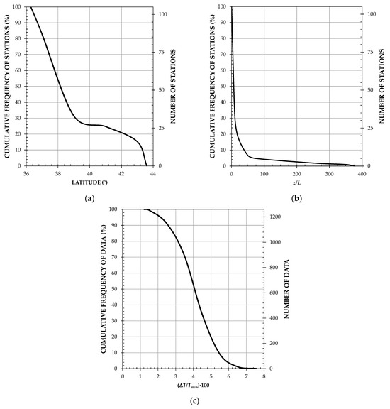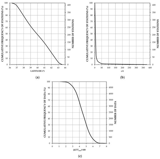 The most widely used models for estimating GSR consist of expressions of the clearness index as a function of the relative sunshine duration, so they are dimensionally homogeneous equations with various mathematical forms. Most equations use site-dependent parameters, but some of them are intended to be valid worldwide. Around 90% of the variability in data recorded at 59 European stations has been explained using relative sunshine hours, elevation, and the monthly index as input variables [18], but data on sunshine duration are not generally available. Looking for a temperature-based approach and as an evolution of the classical model of Hargreaves and Samani [19], a model of the monthly average of the atmospheric clearness index has been previously introduced [20], using the square root of as the only meteorological variable, where is the difference between the monthly average of daily maximum temperature, (in K), and the monthly average of daily minimum temperature, (in K), and assuming that the proportionality coefficient depends on the ratio between the elevation (in m) and the distance to the sea (in km). This simple and dimensionally homogeneous model has been evaluated with acceptable results in localities of the northern Spanish coast [11,12,13,17,20] and two large areas of central and southern Spain, with very different climatology and latitude. The comparison with other temperature-based models in each of the three zones showed both the advantages of this model for obtaining general equations applicable in each zone and the influence of latitude on the geographical variability of the model coefficients [12].