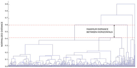 Among the various criteria in the literature for determining the number of clusters, the one proposed by Kaushik has been adopted [27]. This procedure is based on the construction of the dendrogram and recommends that the number of clusters is the number of vertical lines cut in the dendrogram by a horizontal line that can traverse the maximum distance vertically without intersecting a cluster.