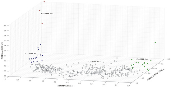 From the dendrogram shown in Figure 4, it is deduced that 4 clusters are obtained for the 414 stations considered in Cases 1 and 2. The stations included in each cluster are specified in Table 1, and the distributions of stations and clusters in the normalized space are shown in Figure 5. Cluster No.1 includes only 3 stations, which are very close to the Cantabrian coastline and have a Cfb-type climate. The 14 stations included in Cluster No.2 are also located on the north coast, 11 of which have a Cfb climate, and the remaining ones have a Csb climate. Cluster No.3 includes 7 stations with climate type Csa, 5 stations type BSh, 4 stations type BSk, and 2 stations type BWh, some of them with relatively high values, especially station No.24, whose value is only surpassed by the stations of Cluster No.1. Cluster No.4 is much bigger than others are, as it includes 381 stations, which represent 92% of the stations, and has a greater climatic variety.