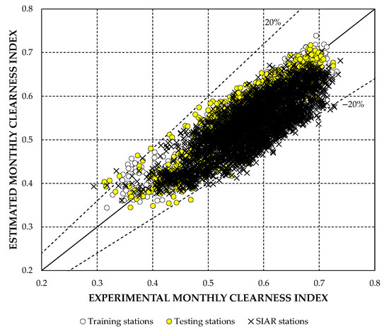 To analyze the influence of latitude, mathematical methodology, and possible seasonal effects, a model based on a simple ANN was recently developed to estimate the monthly clearness index for the set of 105 stations located in the three areas of peninsular Spain previously studied. Using , , the latitude and a monthly index as input variables. This approach allowed the improvement of the accuracy of previous models for both statistical indicators averaged for the set of stations and local deviations [13].