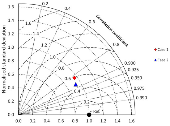 Table 3 allows the comparison of the statistical results in both cases. The RRMSE value obtained in Case 2 for the training and testing stations is very similar, in the order of 6.9%, which indicates that the stations chosen for training represent acceptably the testing stations. Figure 8 allows a comparison between the two cases by means of a Taylor diagram, which is based on Equation (8) [33].