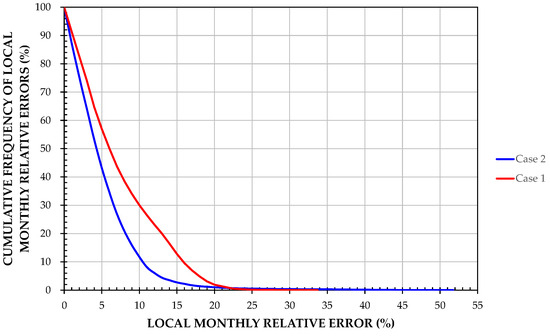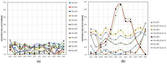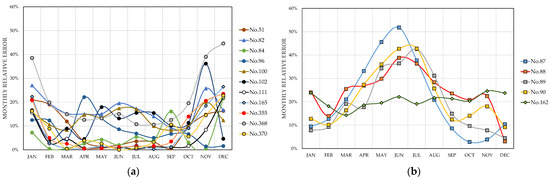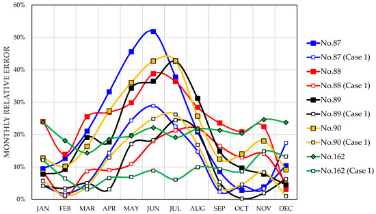 It is interesting to note that in Case 1, stations No.87–90 and 162 also have the highest number of monthly relative errors above 20%. Figure 12 shows that the trends are similar in both cases but with more moderate errors in Case 1.