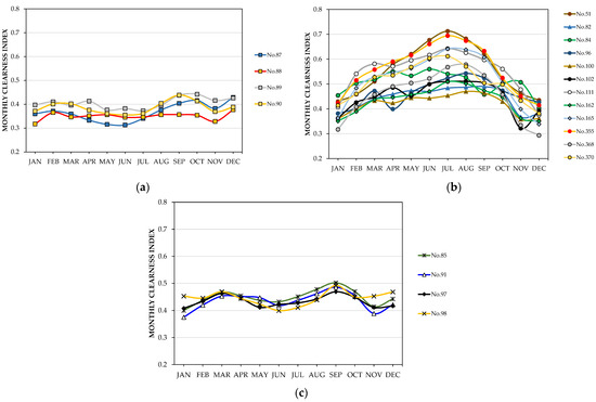 Variability of the monthly clearness index at (a) stations with any monthly relative error value greater than 20% and ; (b) stations with any monthly relative error value greater than 20% and ; (c) remaining stations with or close to zero.