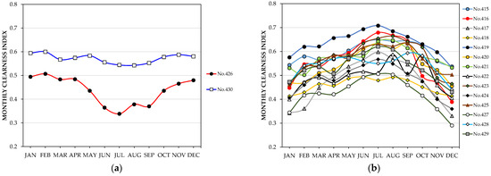 Figure 11a shows the low variability of the monthly clearness index measured for stations No.87–90, with the peculiarity that the difference between the clearness index values in June and December, , is negative. This observation contrasts with the seasonal variability of the clearness index shown in Figure 11b for the remaining 12 stations that also present some monthly error higher than 20%.