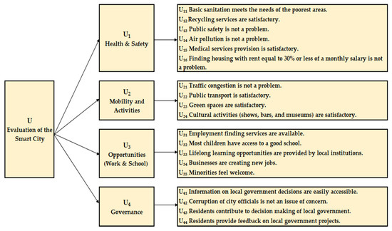 The evaluation of smart cities serves as the primary goal (U). The quality at the criterion level is impacted by various factors, so it should be incorporated into the evaluation system as seen below: