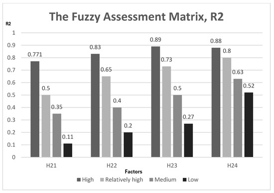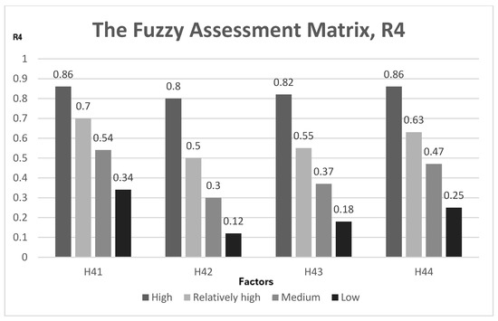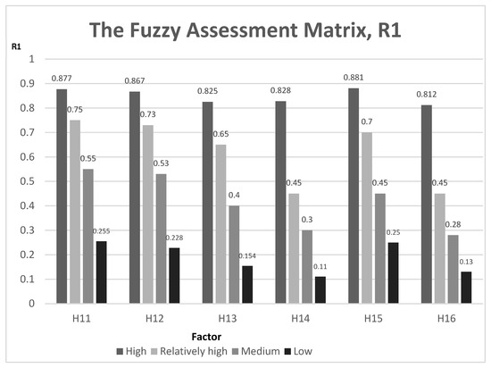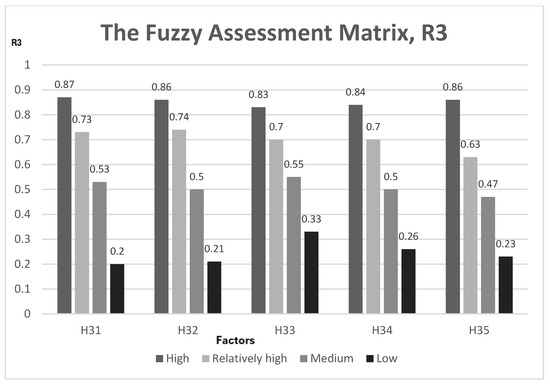 The Fuzzy evaluation matrix and Fuzzy assessment matrices R1, R2, R3, and R4 are presented in Figure 3, Figure 4, Figure 5 and Figure 6. The Fuzzy assessment matrices R are used to evaluate different indicators within a framework of Fuzzy Logic. Each entry in these matrices represents the level of membership of an assessment criterion or indication to a specific evaluation class. Each element of the matrix represents the membership level of an indicator to its corresponding criterion, with a value closer to 1 indicating a greater membership degree. The fuzzy assessment matrices are used as the basis for the following stages in the evaluation process, such as weighing and aggregation, to obtain overall assessment outcomes.
