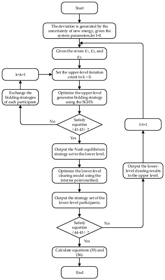 (8) Determine if the bi-level model has converged. During the iterative solution process for the upper and lower levels, if the strategy combinations change, the market clearing results will also change correspondingly. Therefore, the convergence condition for the bi-level model is that the difference in results between two consecutive iterations at both levels falls within a small error range ε 1 , ε 2 , ε 3 , ε 4 , ε 5 , as shown in the following formula: