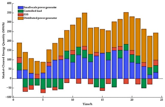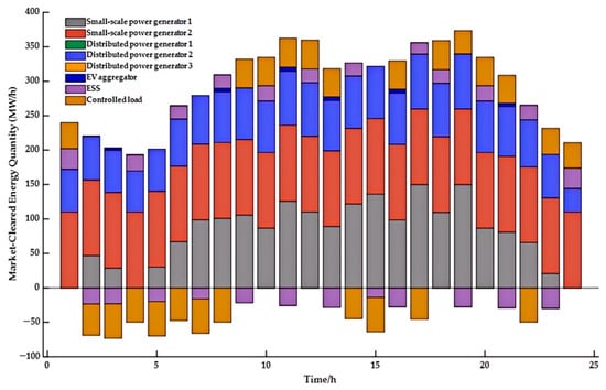 In the microgrid, four fundamental entities are selected to verify the feasibility of their bidding strategies. As shown in Figure 6, during peak load hours (10–15 h), the Distributed Power Generator reaches its highest output, with 199 MW at 12 h, taking on the primary supply task and demonstrating its flexibility and peak generation capacity. The Small-scale Power Generator maintains stable output across all time periods, such as 94 MW at 10 h, making it suitable as a base load supplement. The Controlled Load significantly reduces load during off-peak periods through demand response, with −56 MW at 2 h, effectively smoothing system fluctuations. The ESS exhibits distinct charging and discharging characteristics, charging at 23.5 MW during the off-peak period at 1 h and discharging at 42.17 MW during the peak period at 12 h to alleviate load pressure. Peak-to-valley analysis reveals that the peak load at 12 h, with a total load of 450 MW, compared to the valley load at 2 h, with a total load of 60 MW, shows a significant peak-to-valley difference. The next step will involve expanding the system scale and incorporating more units to achieve better peak shaving and valley filling effects.