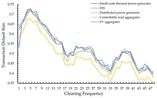 The analysis of Figure 8 shows that as the clearing frequency gradually increases, the transaction default rate exhibits a declining trend. This indicates that with the increase in market clearing frequency, the compliance ability of market participants improves, leading to fewer defaults. However, during the evening peak electricity usage period, due to the concentrated demand, the transaction default rate rises by about 10%, possibly caused by increased market pressure and delays in resource allocation. In contrast, during the average and off-peak electricity usage periods, the transaction default rate is about 15% lower than that during the peak period, which can be attributed to more stable electricity demand and lower market pressure.