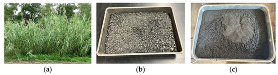 (a) Arundo Grass, (b) Arundo Grass Biochar, and (c) Sieved Arundo Grass Biochar.
