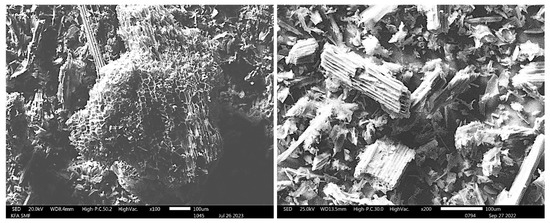 Scanning electron microscopy (SEM) analysis (Figure 3) revealed that Arundo grass biochar has a porous, honeycomb-like microstructure with angular and elongated particles. This morphology, formed by the release of volatiles during pyrolysis, makes it an excellent interlocking agent in concrete, where the pores also create adsorption sites for CO2. Additionally, these pores help retain water in the mix, which aids in secondary hydration and further hardens the cement paste.