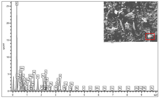 Energy dispersive X-ray spectroscopy (EDS) analysis (Figure 4) confirmed the elemental composition of the Arundo grass biochar, with primary elements including calcium, oxygen, and potassium, and lower levels of magnesium, aluminum, chromium, iron, manganese, and silicon. The relatively low silicon and aluminum content, however, may limit pozzolanic activity, potentially impacting the strength and durability of the biochar–concrete blend.