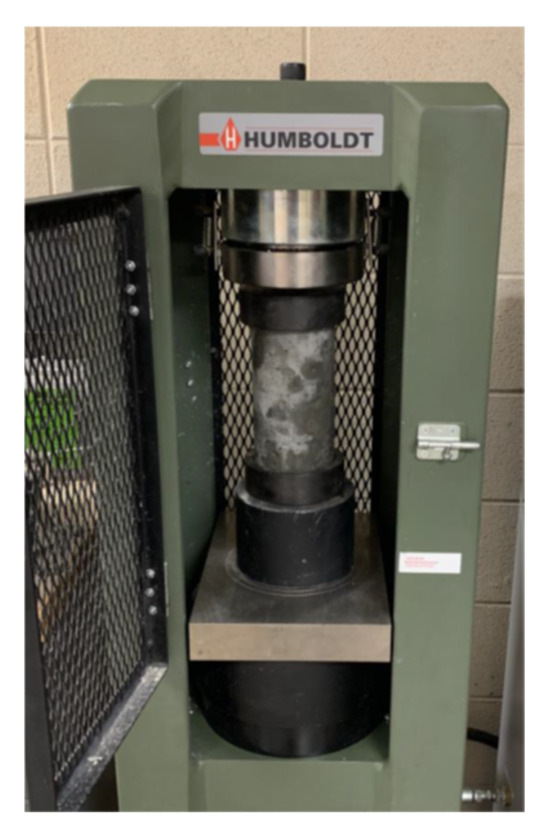 The compressive strength of the biochar concrete samples was tested following the procedures outlined in ASTM C39 [31], the Standard Test Method for Compressive Strength of Cylindrical Concrete Specimens (Figure 6). For this analysis, three cylindrical samples measuring 4 inches in diameter and 8 inches in height (100 mm × 200 mm) were tested for each mixture type at both 7 and 28 days of curing.