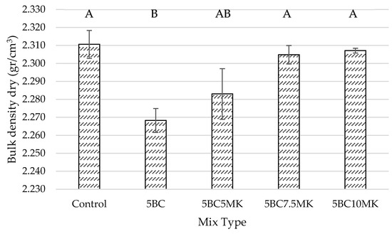 Bulk Density. (Letters A and B represent statistically distinct outputs for bulk density. AB indicates no statistically significant difference between mix types).