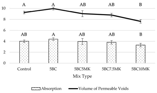Absorption and Volume of Voids. (Letters A and B represent statistically distinct outputs for absorption and volume of permeable voids. AB indicates no statistically significant difference between mix types).