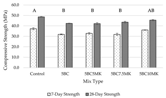 Compressive Strength at 7 and 28 Days. (Letters A and B represent statistically distinct outputs for compressive strength. AB indicates no statistically significant difference between mix types).