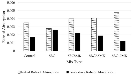 - The inclusion of 5% biochar decreased the initial rate of absorption and improved long-term durability by forming a denser and less permeable matrix. Conversely, metakaolin increased the initial absorption rate due to its fine particle size and reactivity but refined the pore structure over time through pozzolanic reactions. This complementary behavior highlights the potential of combining biochar and metakaolin to optimize both early-age performance and long-term durability, offering a balanced approach to sustainable construction materials.