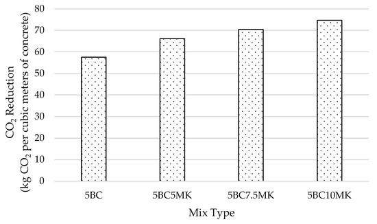 This study investigated the incorporation of Arundo grass biochar (5%) and varying percentages of metakaolin (5%, 7.5%, and 10%) as partial cement replacements to reduce the carbon footprint of concrete production. The environmental impact assessment is based on the average CO2 emissions for Portland cement type I/II (approximately 0.9 kg CO2 per kilogram), metakaolin (0.33 kg CO2 per kilogram), and the carbon sequestration potential of Arundo grass biochar. With a carbon content of 80%, 1 kg of biochar corresponds to 3.67 kg of CO2 sequestration. Figure 11 illustrates the CO2 reduction achieved by biochar-incorporated concrete, both with and without metakaolin supplementation. The results emphasize biochar’s role in significantly reducing the carbon footprint of concrete while showcasing the additional contributions of metakaolin in low-carbon concrete technologies. This study highlights the potential of synergistic material combinations to achieve sustainable construction solutions without compromising performance.