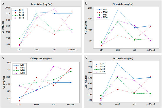(a–d). Effect of different application treatments of MB (Ctrl-no MB, seed-MB on seed, soil–MB in soil, soil/seed-MB on seed and in soil) on the uptake of toxic trace elements (Cr, Pb, Cd and As).