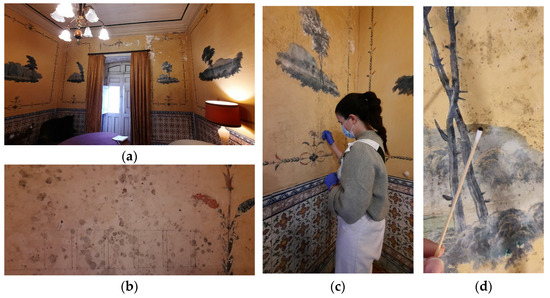 Figure 2. Pillement Room: (a) general view; (b) in situ test of biocides; (c,d) sample collection for laboratory tests.