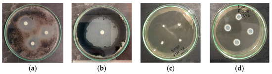 Figure 3. The disk diffusion contact method for Cladosporium cladosporioides: (a) pennyroyal essential oil; (b) positive control (BT, 1% v/v), and micro-atmosphere tests for Penicillium brevicompactum; (c) mixture of essential oils; and (d) negative control (SDS, 1% w/v).