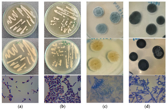 Figure 4. The colony morphology (surface and reverse) and microstructure after 7 days of incubation for fungi and 2 days for bacteria at 22 °C: (a) Bacillus wiedmannii; (b) Bacillus mobilis; (c) Penicillium brevicompactum; (d) Cladosporium cladosporioides.