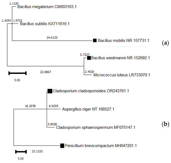 Figure 5. Phylogenetic tree of species identified in the Moscadim house in relation to species found in other similar projects; (a) represents bacterial species and (b) represents fungal species. The species marked with a square symbol (■) are those analyzed in this study, along with their respective accession numbers.