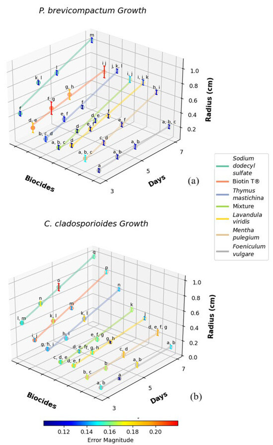 Figure 6. Growth of Penicillium brevicompactum (a) and Cladosporium cladosporioides (b) colonies over time in response to different essential oil-based biocides. The graph presents the mean colony radius (cm) measured at 3, 4, 5, and 7 days, with confidence intervals at significance level α of 0.05 included for each measurement. The essential oils tested include fennel (Foeniculum vulgare), lavender (Lavandula viridis), pennyroyal (Mentha pulegium), thyme (Thymus mastichina), a mixture of EOs, sodium dodecyl sulfate as a control, and the commercial biocide Biotin T®. Means marked with different letters within the same species are significantly different at a statistical level of 0.05.