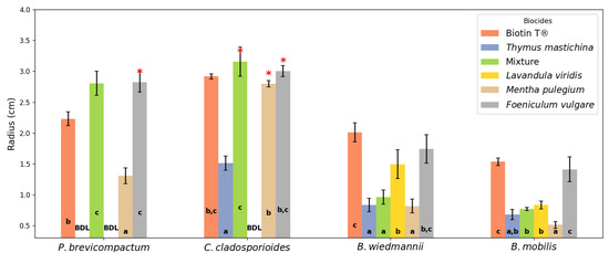 Figure 7. Inhibition halos (radius, in cm) measured after 4 days of exposure to different essential oil-based biocides and the commercial biocide Biotin T® against the fungi Penicillium brevicompactum and Cladosporium cladosporioides, and the bacteria Bacillus wiedmannii and Bacillus mobilis. The EOs tested include Foeniculum vulgare (fennel), Lavandula viridis (lavender), Mentha pulegium (pennyroyal), Thymus mastichina (thyme), and a mixture of these EOs. Biotin T® served as the positive control. a–c Means with various superscript letters within the same treatment indicate a significant difference. “BDL” indicates inhibition below the detection limit. Error bars represent the confidence intervals at significance level α of 0.05 of the mean. An asterisk (*) above a bar indicates that the inhibition halo radius was larger than measured due to the distance between the disk and the Petri dish.