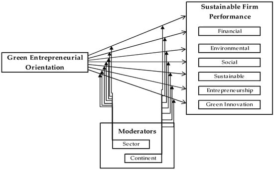 Therefore, the purpose of this study is to examine the relationships between green entrepreneurial orientation and sustainable firm performance and its sub-dimensions, “financial, environmental, social, sustainable, entrepreneurial and green innovation performance”. In line with this purpose, it is based on examining all empirical studies in the literature on the subject with the meta-analysis method and making a more holistic judgment. This study aims to make three main contributions to the literature. Firstly, although there is a basic body of knowledge in the literature determining the relationship between green entrepreneurial orientation and sustainable firm performance, performance has been evaluated by different metrics such as financial, environmental, social, sustainable, entrepreneurial, and green innovation performance. In this respect, the study provides a comprehensive perspective to the literature by using a multidimensional conceptualization in terms of performance indicators. Secondly, although individual studies examine the relationship between green entrepreneurial orientation and sustainable firm performance [,,], this study is important in presenting the current evaluation of the literature using meta-analysis. The meta-analysis method reveals the relationship between green entrepreneurial orientation and sustainable firm performance with a larger sample. Furthermore, this study attempts to fill the gap in the existing literature by assessing the moderating effect of sector and continent on the relationship between green entrepreneurial orientation and firm performance. Thirdly, the results of the analyses are essential in guiding businesses and managers in their strategic goals as well as the implications they have added to the literature.
