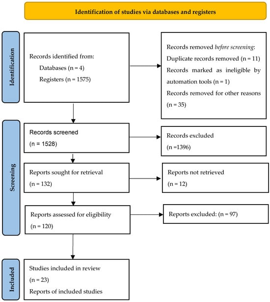 A PRISMA flowchart was used to obtain the dataset in the research, and 1575 studies were found in the relevant databases, including the relationship between GEO and SFP. For the purpose of this study, publications, such as books, book chapters, book reviews, and editorial material, were excluded since they did not make it possible to examine the relationship between variables. In addition, the English language was filtered within the scope of the study, studies that were not compatible with the keywords and did not contain information, such as correlation or regression coefficients to evaluate the relationships between the research variables, were excluded. Also, in the meta-analysis, data based on studies examining the relationship between GEO and SFP and studies with a sample size below two were excluded []. As a result of the dataset obtained from the databases, 23 studies were included in the meta-analysis.