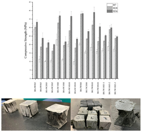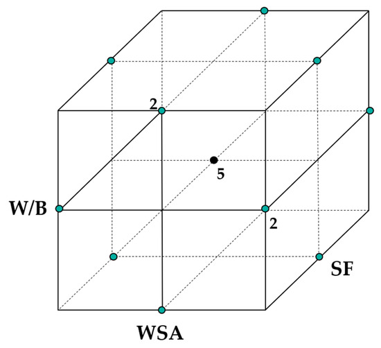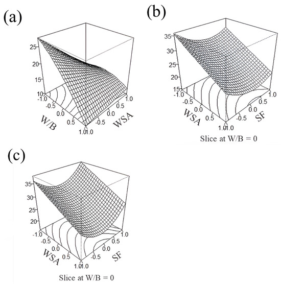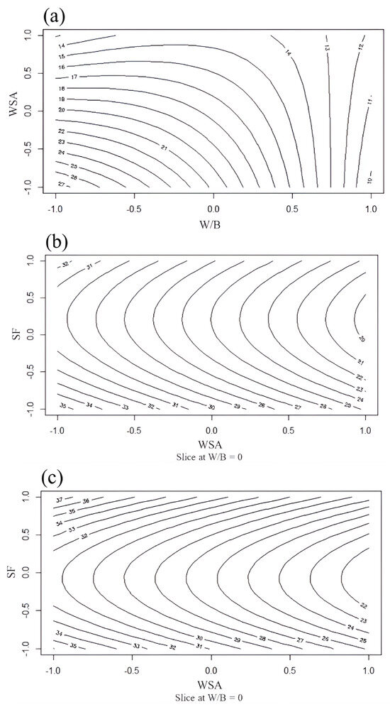 This research demonstrated that the use of agricultural and industrial wastes, specifically wheat straw ash (WSA) and silica fume (SF), as supplementary cementitious materials (SCMs), is technically feasible in certain proportions. Three statistical models were developed using the Box-Behnken design (BBD) that accurately predicted the strength of all possible combinations of W/B variables in the range of 0.4 to 0.6, SF at 0–10% cement replacement by mass, and WSA at 0–20% with good (, , and ). These models explained a large portion of the observed variance, and the lack of fit was non-significant (p > 0.05), indicating a good fit over the experimental points (, and ).