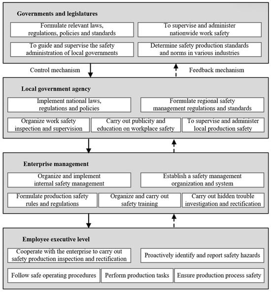 Given that STAMP theory utilizes a control hierarchy rooted in adaptive feedback mechanisms to elucidate systems and accidents, it is imperative to construct an SMS based on system theory. This necessitates the adoption of a top-down systems engineering approach that fully integrates safety into the design process to impose constraints and control behaviors across various hierarchical layers effectively. The configuration of management and control structures should be tailored to the specific characteristics of the system in question. By analyzing the existing management hierarchy, functional distribution, and typical accident cases of enterprises, the multilayered control requirements for safety management were summarized [27,28]. Based on the core concepts of STAMP theory (system safety constraints and hierarchical management and control structures) and combined with the safety management practices of industrial and trade enterprises, a multi-level safety management and control structure model was developed, as shown in Figure 1. This structure ensures that safety measures are systematically embedded and enforced at every operational level, thereby facilitating a comprehensive and coherent safety management strategy throughout the organization.