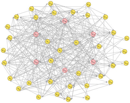 In previous accident investigation reports, summaries typically focused on identifying the causes of accidents without analyzing the interrelationships between these factors. To delve deeper into the root causes of accidents, complex network theory was introduced to examine the correlations between causative factors and their chain formation from a causal chain perspective. Complex network theory is a powerful analytical framework that is used to study interconnected systems by examining the relationships between individual components. It utilizes graph theory to represent these systems, where nodes signify elements (e.g., causative factors) and edges indicate their interactions or dependencies. The relationships between the identified causative factors in Table 1 were analyzed using complex network theory, and the results are shown in Figure 2. In this diagram, nodes represent elements (accident causes and accident types), and arrows indicate their interactions or dependencies (for example, an arrow from V1 to V40 and V27 represents that an incorrect judgment of V1 may directly lead to a V40 mechanical injury accident, or cause V27 equipment damage).