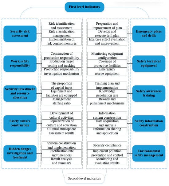A comprehensive safety management evaluation index system is developed to construct an SMS for industrial and trade enterprises. This system is based on an analysis and synthesis of previous accident cases and existing safety management practices, and is aligned with the principles of comprehensiveness, scientific rigor, systematization, and operability (Figure 3). The index system encompasses 10 primary evaluation indicators and 30 secondary indicators, covering various aspects such as the construction of the SMS, safety standardization, dual system construction, occupational health management integration, the safety responsibility system, and foundational safety management practices. Utilizing this index system, it is possible to conduct a thorough evaluation of the safety management and governance capabilities of industrial and trade enterprises. This comprehensive assessment provides scientific and effective guidance for enhancing safety management within enterprises, facilitating the implementation of best practices and ensuring a robust safety culture.