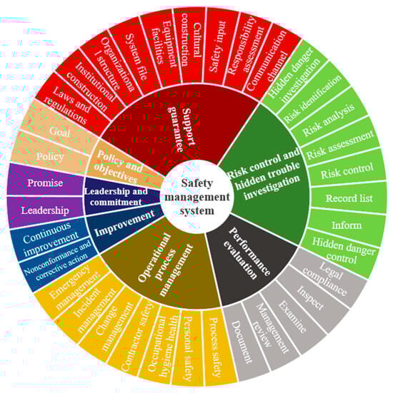 The security and operational stability of large-scale infrastructure and modern enterprises hinge significantly on the establishment and implementation of robust SMSs. Nevertheless, traditional SMS frameworks encounter numerous challenges, including issues related to asymmetric information, inflexible management systems, and incomplete risk control [10,11,12]. As a prevalent method for assessing safety performance, SMSs guide enterprises in aligning their production operations with regulatory standards [13,14]. Although specific SMS requirements vary across industries and regulatory environments, they generally adhere to a fundamental framework. Key components essential to any SMS include the identification of safety hazards, implementation of corrective measures to uphold safety standards, continual monitoring and periodic evaluation of safety performance, and ongoing enhancement of overall SMS effectiveness [15]. The pivotal dimensions of an SMS encompass critical elements, such as formulating safety policy, fostering employee engagement through incentives, enhancing employee competencies through training and development, facilitating the effective communication and dissemination of risk information and control measures, developing proactive measures for prevention and emergency response, and adopting rigorous control and review mechanisms [16,17]. Hence, the cornerstone of establishing an effective SMS lies in meticulously determining the appropriate hazard identification and control measures.
