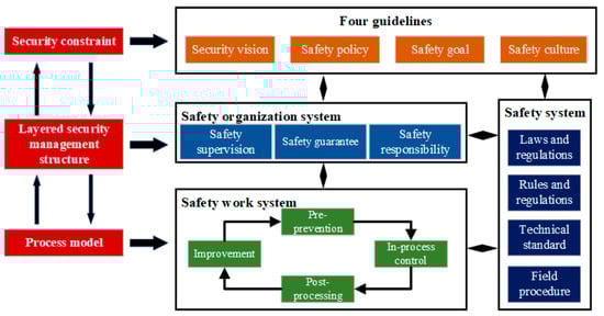 Upon analyzing safety science theory and SMSs, it becomes evident that an SMS based on STAMP theory is intricately linked with the process of risk identification. This system offers advantages such as self-optimization and adaptability during operation. The modern SMS for industrial and trade enterprises, which is based on the STAMP theory, incorporates three fundamental structures proposed by the STAMP theory: security constraints, hierarchical safety management and control structures, and process models. Through a systematic assessment of the current management practices in modern industrial and trade enterprises and integrating insights from the systems with data from security risk databases, a framework for an SMS for modern industrial and trade enterprises based on the STAMP model was formulated. This framework is depicted in Figure 6, encompassing “four guidelines” and “three systems”.