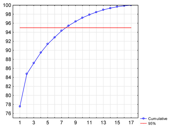 To select parameters for modeling the neural network, PCA was used. The eigenvalues of the principal components were calculated; their number at the beginning was limited by the software itself to 17. As can be seen from Table 1, the cumulative % of variance for the eight principal components will achieve 95% of the variance of the data. This means that these eight principal components contain 95% of the information (measured by variance) that the original 144 features contained. This is also shown in Figure 1.