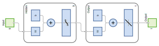 The optimal modeling results were obtained using a network consisting of nine neurons. This result was obtained after 5 epochs (Figure 2). The outcomes derived for the optimal neural network, along with the performance metrics associated with this network are shown in Table 3, where training stops after six consecutive increases in validation error (or no error reduction), and the optimal results are derived from the iteration with the minimum validation error.