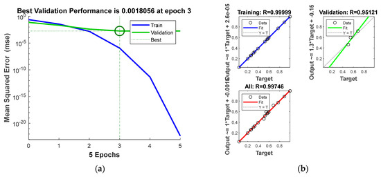 The Mean Squared Error (MSE) metric was used to evaluate the quality effectiveness of artificial neural networks (ANNs). The results showed that optimal validation was achieved during the third epoch. This is shown in Figure 3a. Regression plots for training, validation, and all datasets are shown in Figure 3b.