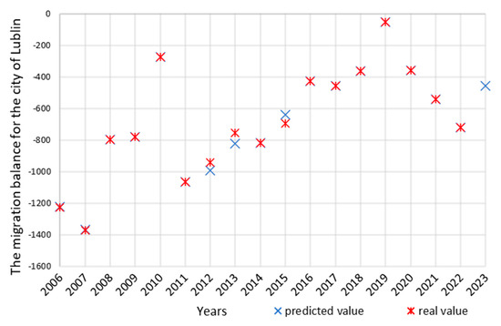 The juxtaposition of empirical data and the data obtained as a result of the prediction, as well as the forecast of migration balance for the city of Lublin for the one year ahead is presented in Figure 4. The predicted data, in many cases, closely align with the actual values, demonstrating the high accuracy of the ANN model. This alignment is further evidenced by the fact that the predicted points on the graph are located directly beneath the actual data points, indicating minimal deviation between the two. Such a high degree of agreement reflects the robustness of the model in capturing the underlying trends and relationships within the migration data, enabling reliable forecasts.