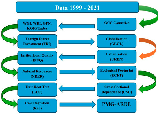 This study utilizes the yearly data of GCC economies spanning from 1999 to 2021 to examine the correlation between NRER, FDI, GLOL, INSQ, URBN, and ECFT. The study utilizes data sourced from reputable databases, including the World Development Indicators (WDI), Worldwide Governance Indicators (WGI), Global Footprint Network (GFN), and the KOF Globalization Index. The dataset was structured as panel data and analyzed using specialized software such as EViews 9.0. Initially, descriptive statistics were employed to examine the data’s properties. Subsequently, cross-sectional dependence (CSD) and unit root tests were conducted to ensure data suitability for panel analysis. The presence of cointegration was assessed using the ADF cointegration test. Finally, the study investigates both short-term and long-term relationships through the Panel Autoregressive Distributed Lag (PMG-ARDL) model. Moreover, Table 1 presents the variables utilized in this study, together with their definitions and the sources from which the data were obtained for research purposes. Additionally, Figure 1 depicts a flowchart that visually represents the entire research process.
