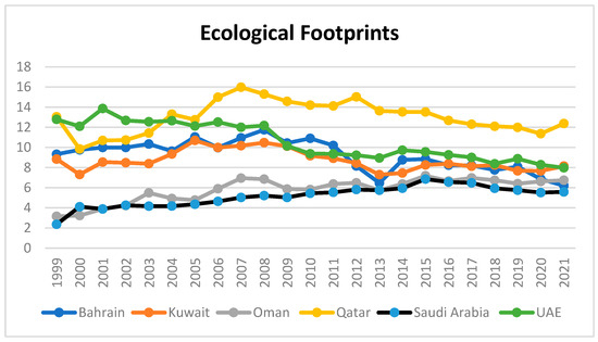 Moreover, Figure 2 represents the trends of ecological footprints in GCC countries from 1999 to 2021. It can be seen from Figure 2 that Qatar had the highest ECFT value (15.97643232) in 2007, and from 2004 until 2021 it had a higher ECFT number than the rest of the GCC countries. Additionally, in Saudi Arabia, the ECFT value has always been lower as compared to the other GCC countries; additionally, this country showed the lowest ECFT value among all GCC countries, at 2.358017521 in 1999. However, it is worth noting that Saudi Arabia has had an increasing trend for ECFT from 2001 onward.