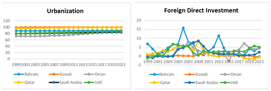 It is evident from Table 6 that FDI has a positive significant relationship with ECFT in the long term at 1% but a negative significant relationship at 5% in the short term. This means that FDI has negative consequences for the environmental quality of GCC countries in the long term. These findings emphasize that although attempts to attract FDI may provide temporary relief to the ecological shortage, they ultimately result in long-term environmental degradation. These findings indicate that the initial beneficial effect on the environment is not able to be maintained, and the long-term effects of FDI on the environment are far more detrimental. URBN shows a negative relationship with ECFT in the long run at a level of 5%, while a positive relationship with ECFT in the short run is present at a level of 10%. Therefore, the GCC should promote URBN, as it has positive impacts on environmental quality. However, its use in the short term should be wisely implemented. Additionally, the trends of FDI and URBN for GCC countries have been shown in Figure 3.