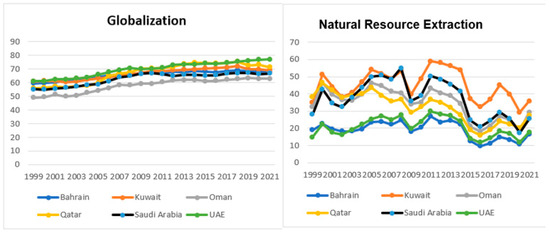 GLOL also shows a significant positive relationship with ECFT at the 10% level, both in the long run and short run. Hence, GLOL has detrimental effects on the ecological condition of GCC countries, both in the short term and the long term. Hence, GCC countries should prioritize the effective exploitation and expansion of GLOL. Embracing GLOL with a focus on light handling would lead to increased ECFTs in GCC economies. However, it is important to be mindful of the potential negative repercussions on the ecological system and environmental quality. NRER has a negative significant relationship with ECFT in the long run at the 1% level of significance, while in the short run it has a positive significant relationship at the 5% level. As the GCC economies have high NRER incomes, their efficient use of natural resources in the long run will have a positive impact on environmental quality. However, their use in the short run should be wisely considered, as they have a detrimental impact on environmental quality. Additionally, the outcomes of the trends of GLOL and NRER for GCC countries have been shown in Figure 4.