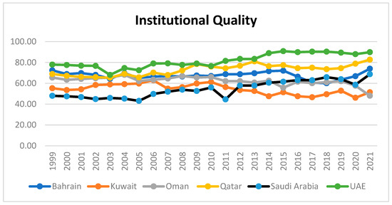 The authors of ref. [60] emphasize the crucial role of strong and efficient institutions in curbing corruption and enforcing strict environmental standards, which collectively foster a healthier and more sustainable environment. According to ref. [61], effective management can significantly improve environmental performance by providing relevant and impactful incentives. In addition, the quality of institutions can occasionally contribute to the acceleration of environmental degradation by amplifying carbon emissions and energy consumption.