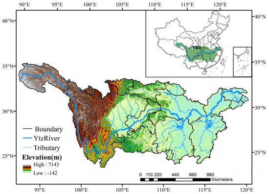 The Yangtze River Basin (YRB), located in the south of China, spans from 24°27′ N to 35°54′ N and from 90°33′ E to 122°19′ E (see Figure 1). The Yangtze River originates in the Qinghai–Tibet Plateau and flows through Qinghai, Tibet, Sichuan, Yunnan, Chongqing, Hubei, Hunan, Jiangxi, Anhui, Jiangsu, and Shanghai, ultimately flowing down into the East China Sea. The YRB is characterized by a diverse geomorphology, comprising three principal topographic segments that span from the source to the basin outlet. These include the Qinghai–Tibet Plateau, which has an average elevation exceeding 3000 m; the mountainous region, which maintains an average elevation of 1000 m; and the Eastern China Plain, where the average elevation is approximately 100 m [34]. Covering an area of 1.8 million km2, the YRB is the largest basin in China, representing nearly 20% of the country’s total land area. It also possesses abundant water resources, estimated at approximately 10,000 billion cubic meters [35], which accounts for about 33% of China’s total river runoff [36]. The average annual precipitation in the YRB is approximately 1070 mm, predominantly in summer, which accounts for more than 60% of the annual total [37] and exhibits a spatial and temporal variability with a decreasing gradient from east to west [38]. Significant increasing trends in mean annual temperature and temperature extremes have been detected in the YRB [39,40]. The rapid growth of population and socioeconomic development has significantly accelerated urbanization processes, which in turn have markedly impacted the local climate and hydrology in the basin [41].