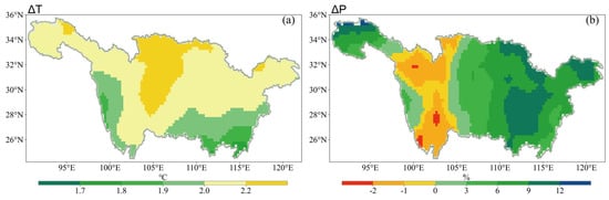 Changes in (a) temperature (°C) and (b) precipitation (%) in YRB under 2 °C warming.